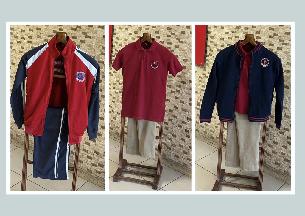 Okul kıyafetlerimiz fotoğraftaki özelliklere sahiptir. Bej renk kumaş pantolon, kırmızı yakalı tişört (4 mevsim)