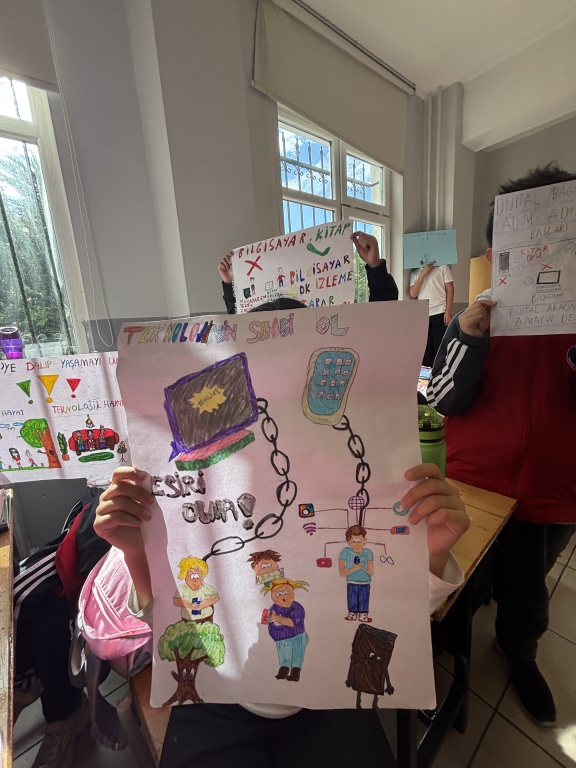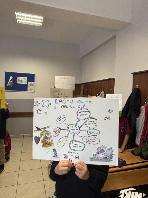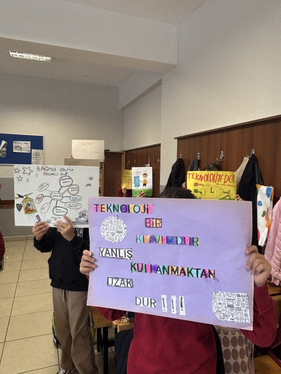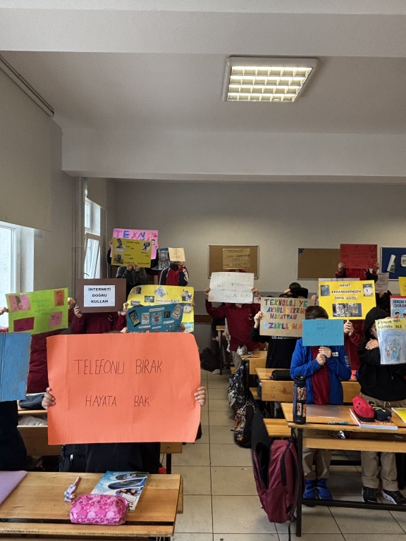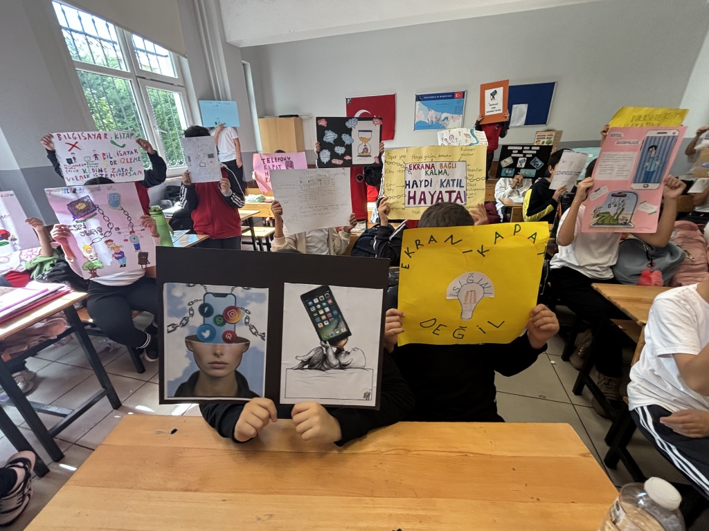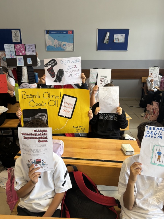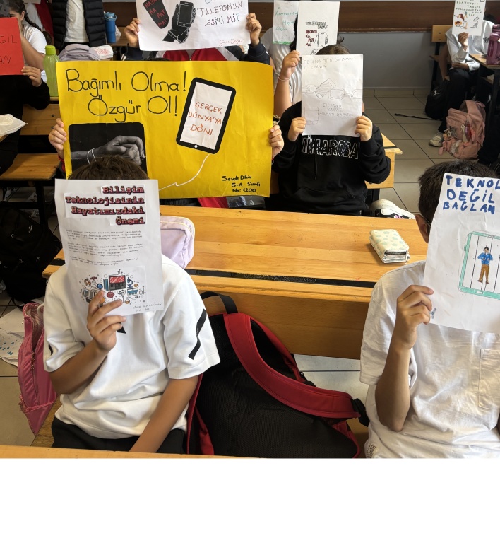 Okulumuz 5. sınıf öğrencileri, dijital bağımlılık konusunda farkındalık oluşturmak amacıyla pankart çalışması gerçekleştirmiştir. Çalışmalarımızla, öğrencilerimizin teknolojiyi bilinçli kullanmalarını, ekran süresini dengeli tutmalarını ve sağlıklı sosyal ilişkiler geliştirmelerini hedefliyoruz.