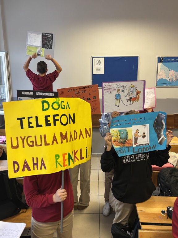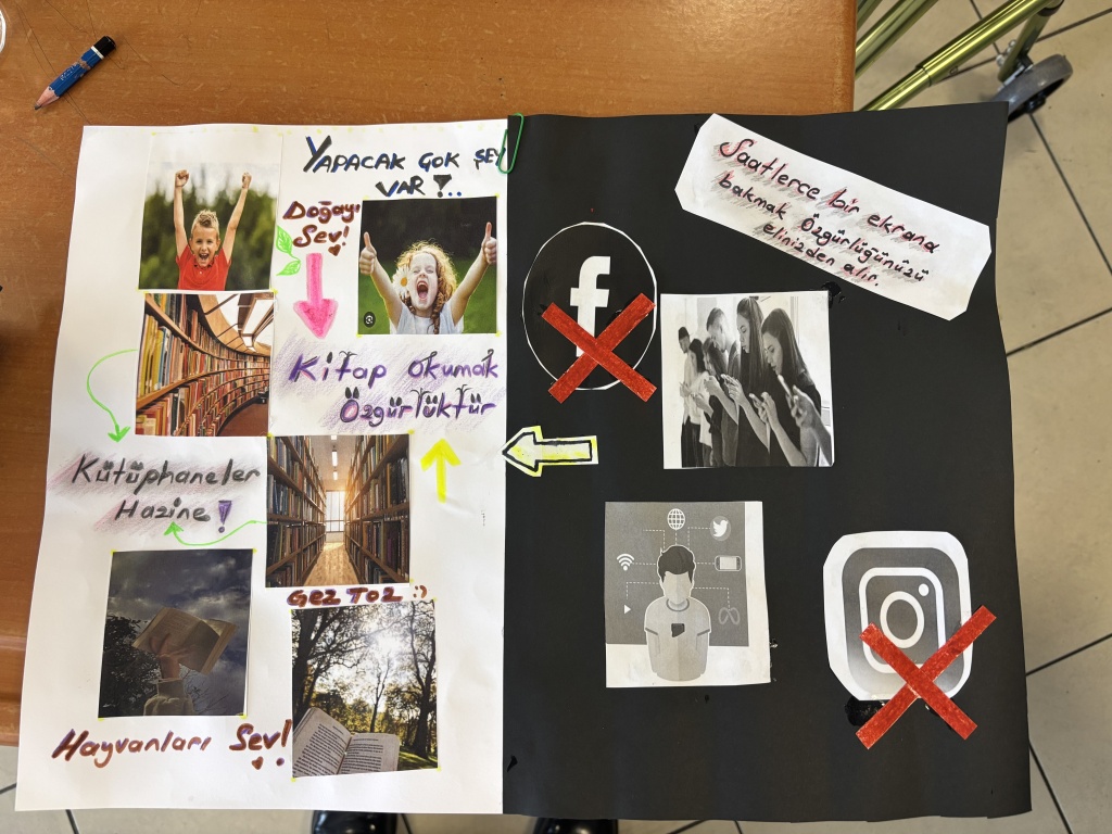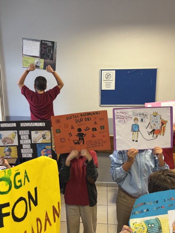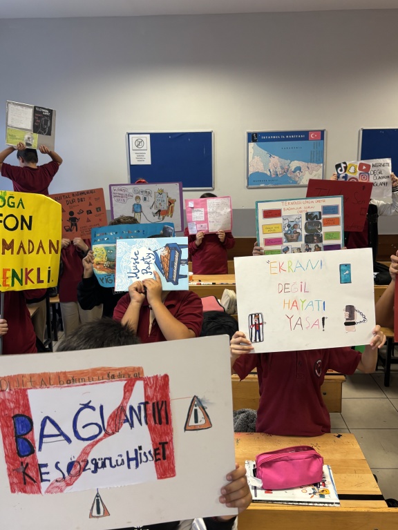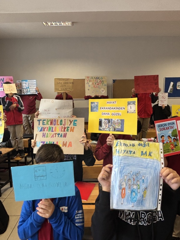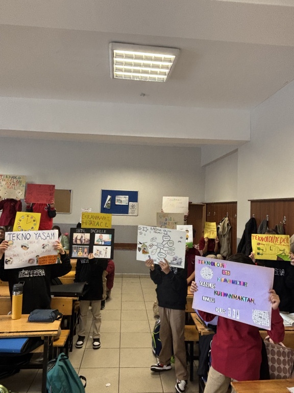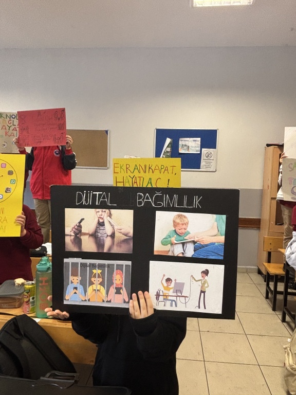 Okulumuz 5. sınıf öğrencileri, dijital bağımlılık konusunda farkındalık oluşturmak amacıyla pankart çalışması gerçekleştirmiştir. Çalışmalarımızla, öğrencilerimizin teknolojiyi bilinçli kullanmalarını, ekran süresini dengeli tutmalarını ve sağlıklı sosyal ilişkiler geliştirmelerini hedefliyoruz.