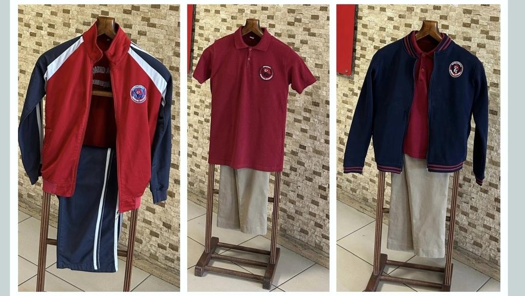 Okul kıyafetlerimiz fotoğraftaki özelliklere sahiptir. Bej renk kumaş pantolon, kırmızı yakalı tişört (4 mevsim)